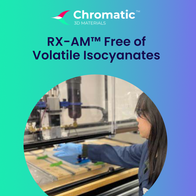 DECEMBER 10, 2024 — In collaboration with the German professional association for occupational safety, BG ETEM tested to determine levels of hazardous chemicals during printing in Chromatic 3D Materials’ German production facilities and revealed no detectable volatile isocyanates. The RX-AM™ platform has therefore been deemed safe for workers without protective measures beyond a standard enclosure.
